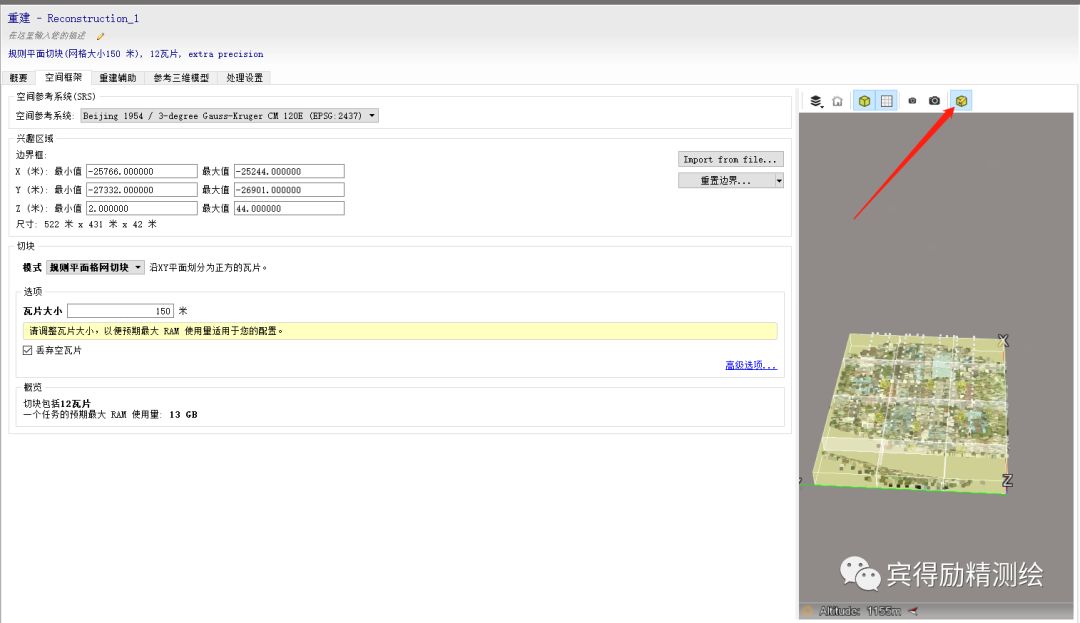 新建重建项目后,在空间框架内选择正确的坐标系,在切块处选择规则平面格网切块或规则立体切块,调整瓦片大小,使得重建需要的内存小于并且接近于电脑内存,同时要给系统运行留有充足的内存空间。
