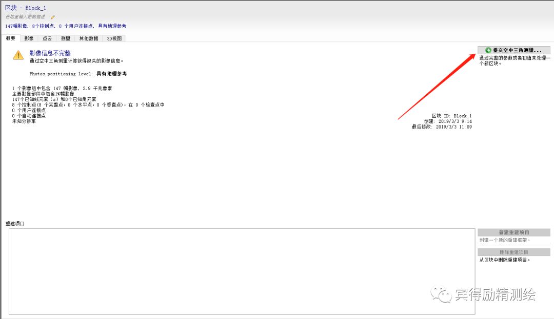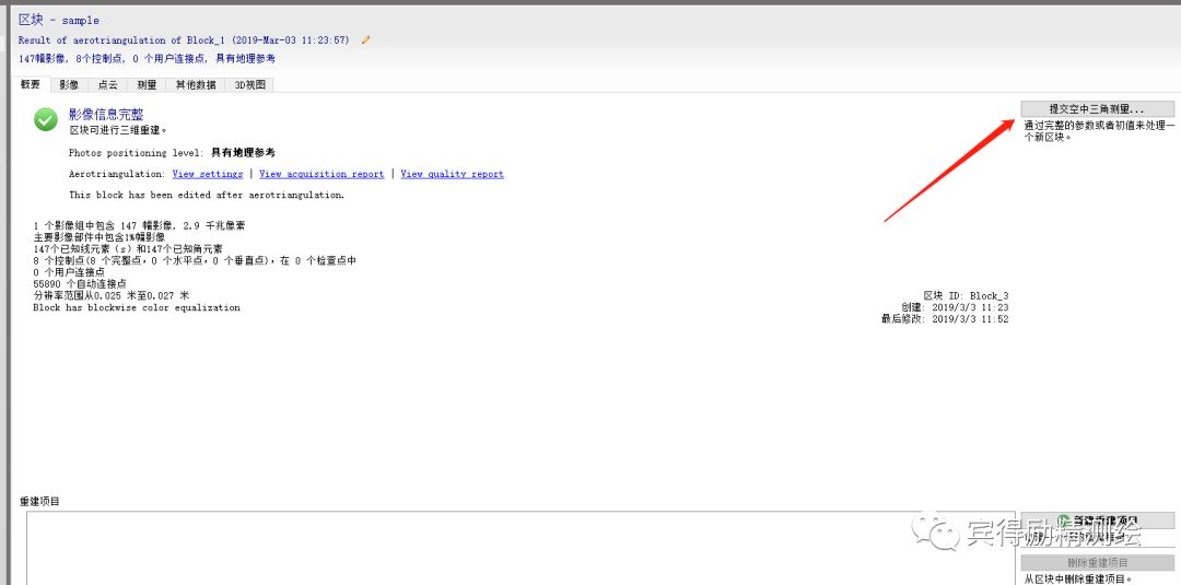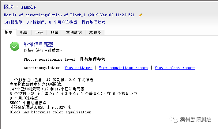 空中三角测量完成,会提示空三成果问题,此界面的View quality report选项即为质量报告。