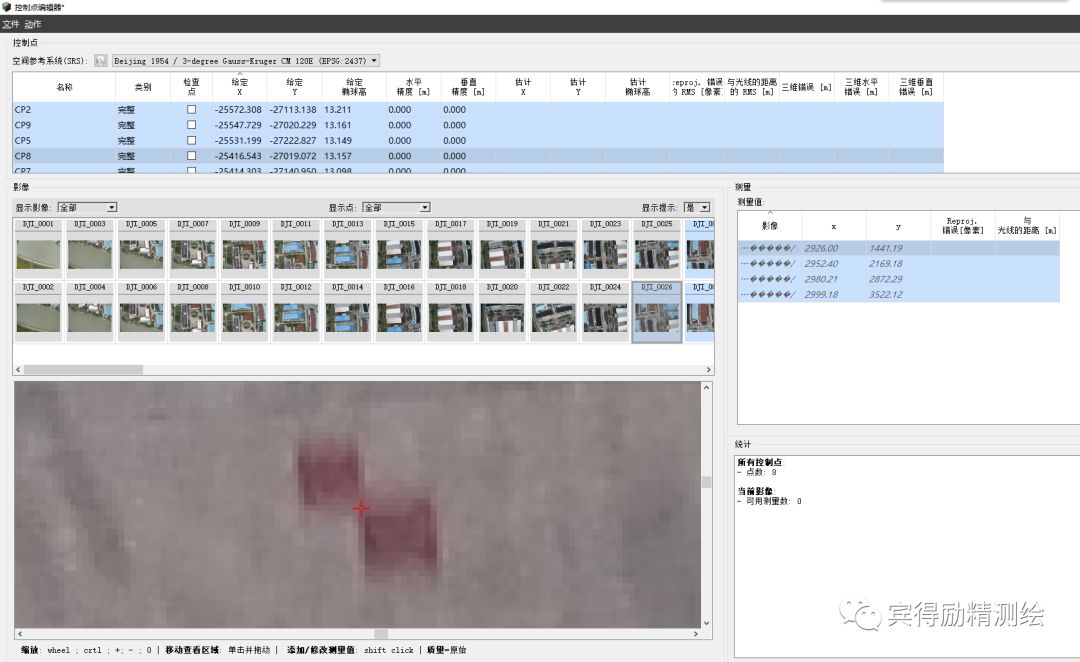 经过一次空三后,控制点编辑器会预测可能的控制点位置,并且推荐出来,此时标记所有控制点,并且尽可能多的标记所在影像位置比较好的,即不位于影像边缘。