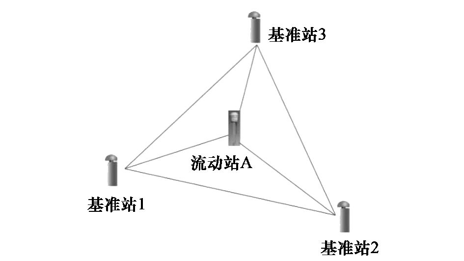 设基准站1、2、3 的坐标分别为( x1,y1,z1 ) 、( x2,y2,z2 ) 、( x3,y3,z3 ) ,则流动站A 与基准站1 间有公式如下: